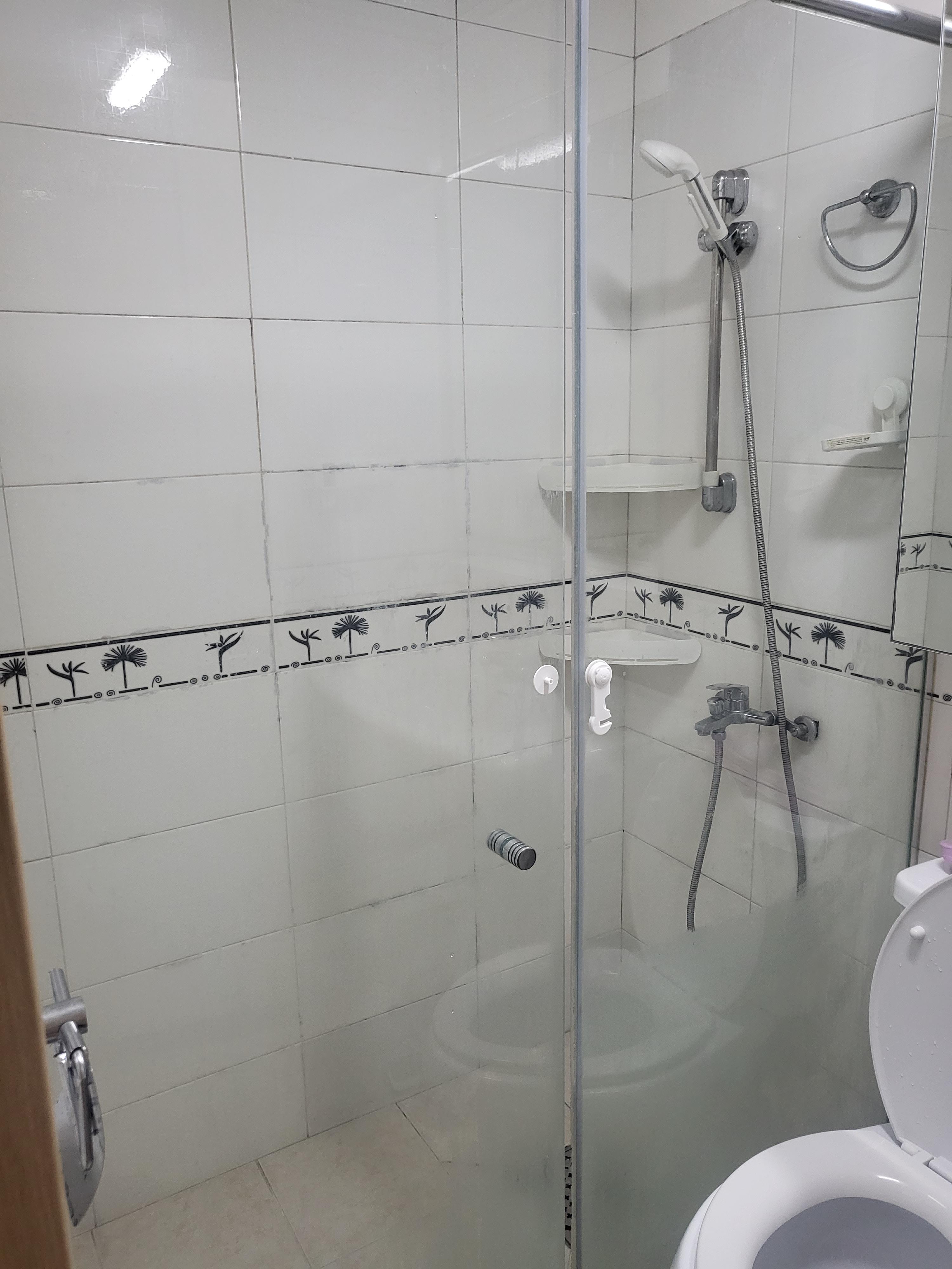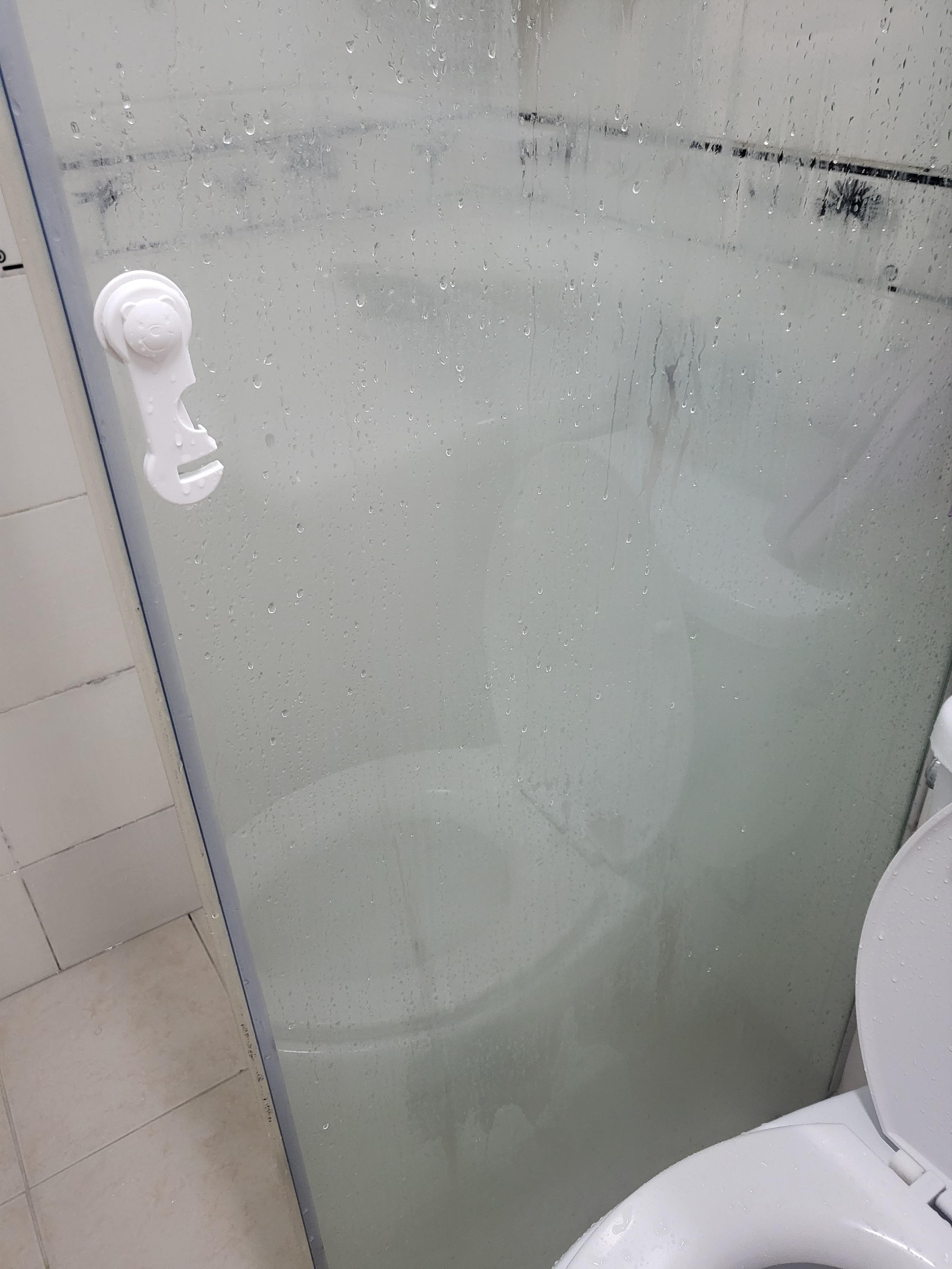 샤워부스 너머 안보이던 물닦이 도구가 보인다.