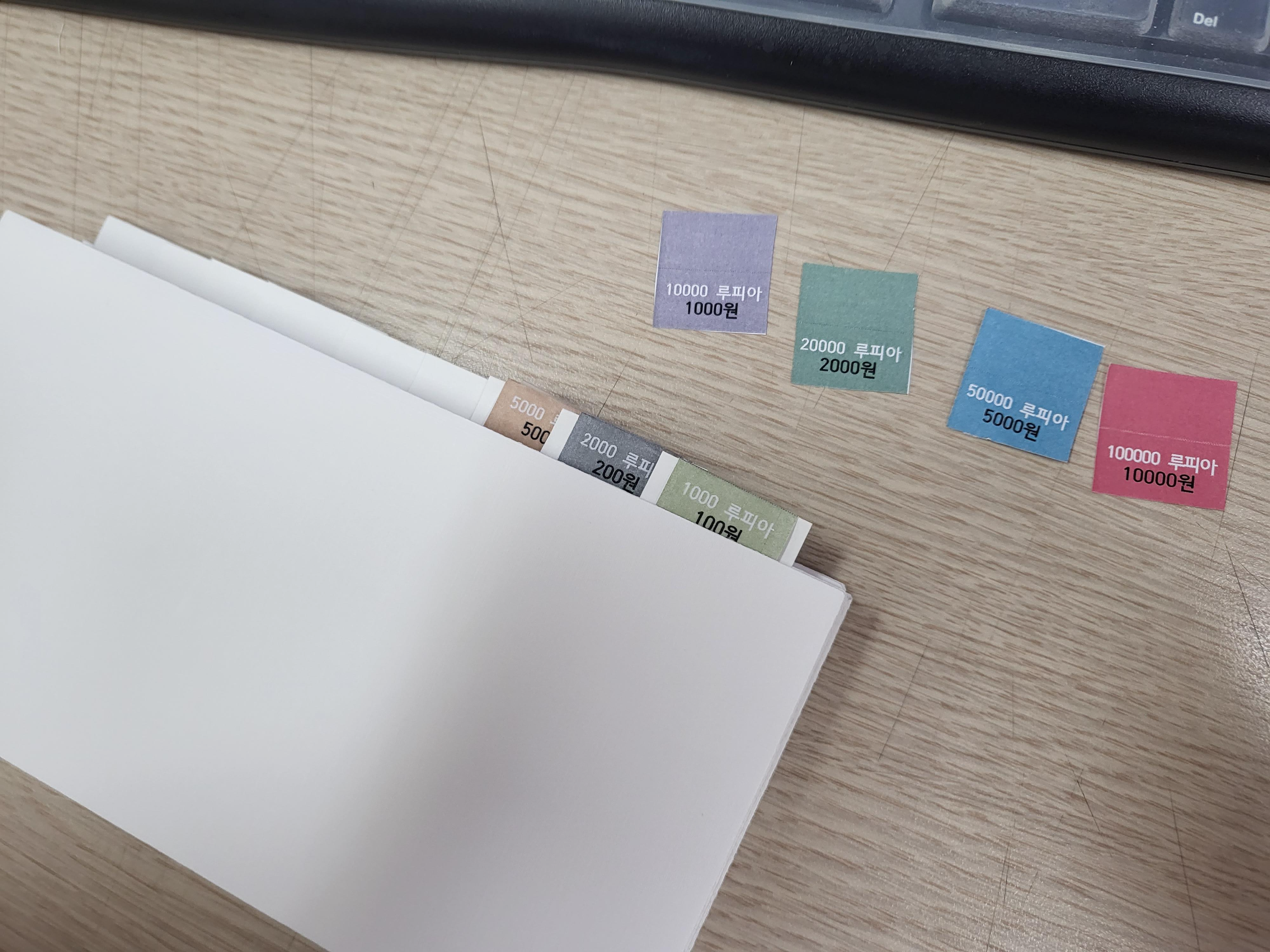 하얀색 견출지를 먼저 붙여주고 그위에 컬러별 루피아단위를 붙이고